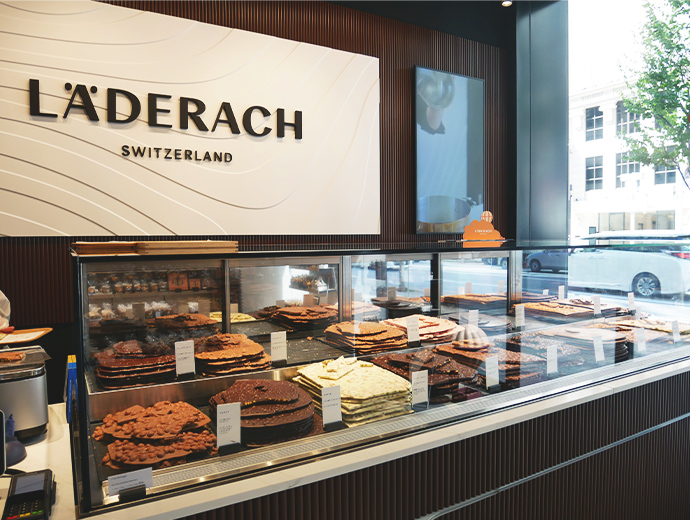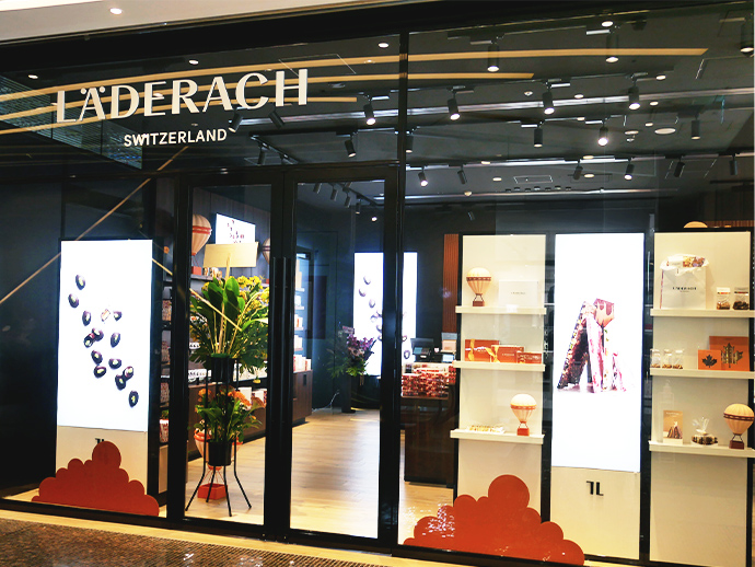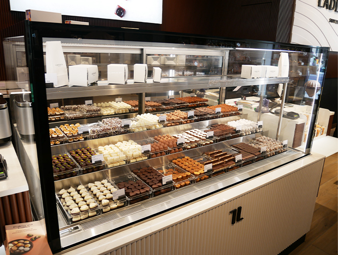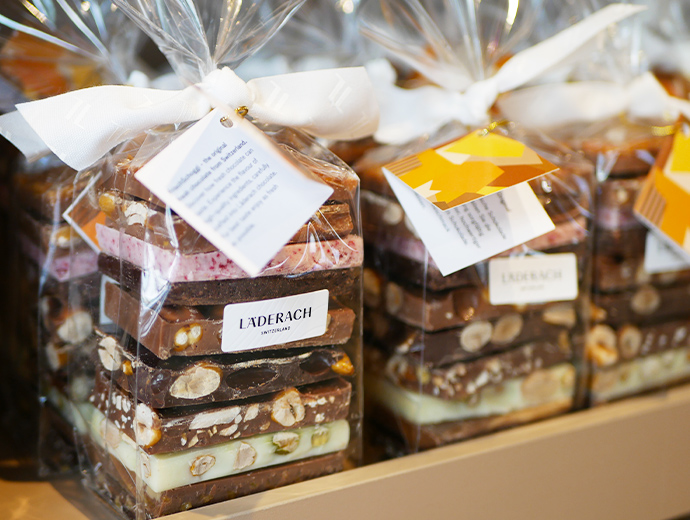Läderachは、1962年にスイスで創業したブランド。「フレッシュさ」にこだわり、厳選された最高級の天然素材と、職人技と最新の技術プロセスを組み合わせた、手作りのチョコレートが店頭に並びます。